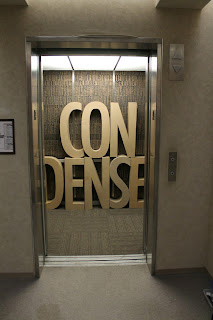 treatment intimidating and eerie. Our other two installations at the library were between the stacks, where knowledge is condensed into books and books are condensed into rows. We spread our letters out across two rows of shelves for one and spaced out the C, O, and N and condensed the D, E, N, S, and E for the other to reflect this.